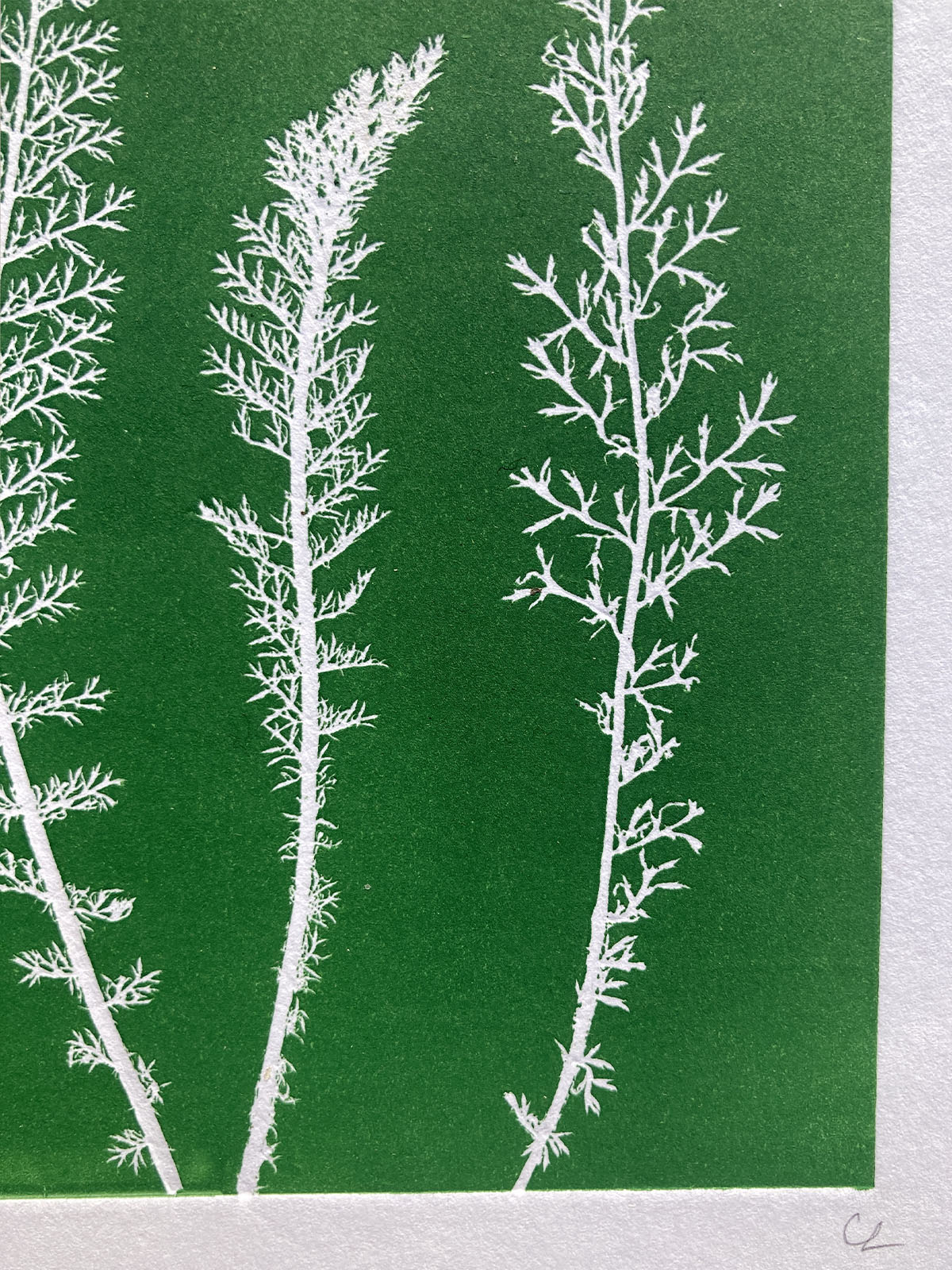 L’étape suivante consiste à déposer la ou les plantes choisies sur une plaque préalablement encrée, une feuille de papier recouvre l’ensemble. Enfin, le passage sous la presse d’héliogravure permet d’obtenir ce qu’on appelle l’empreinte négative.