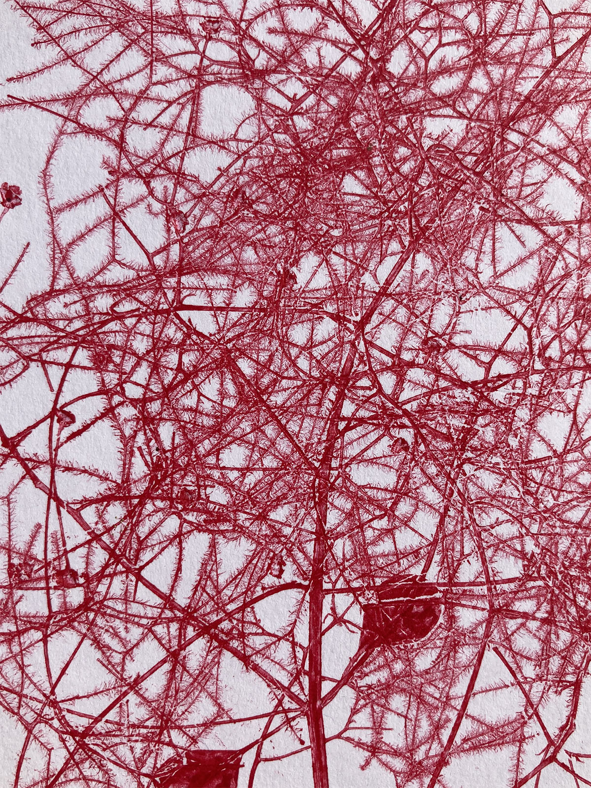 L’étape suivante consiste à déposer la ou les plantes choisies sur une plaque préalablement encrée, une feuille de papier recouvre l’ensemble. Enfin, le passage sous la presse d’héliogravure permet d’obtenir ce qu’on appelle l’empreinte négative.
